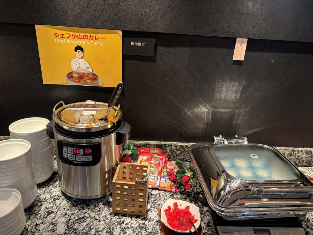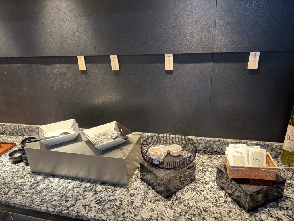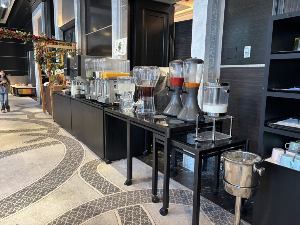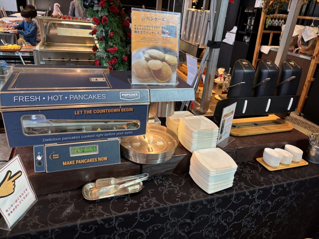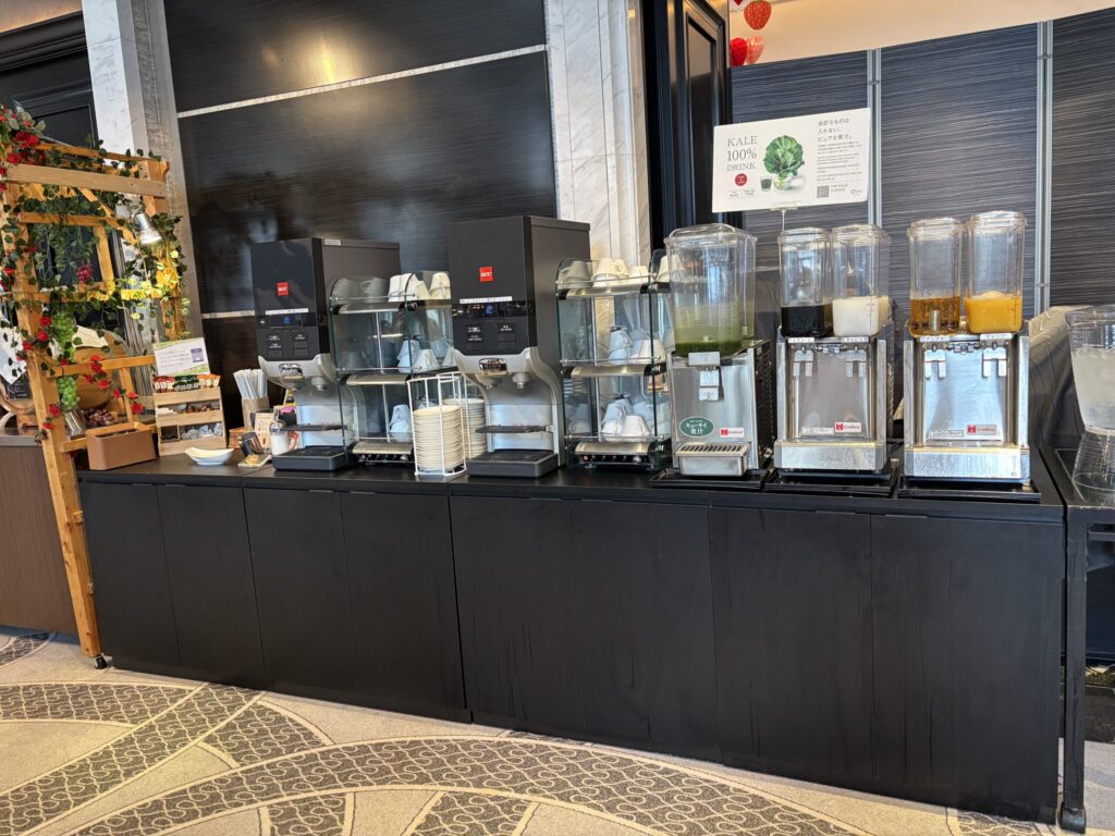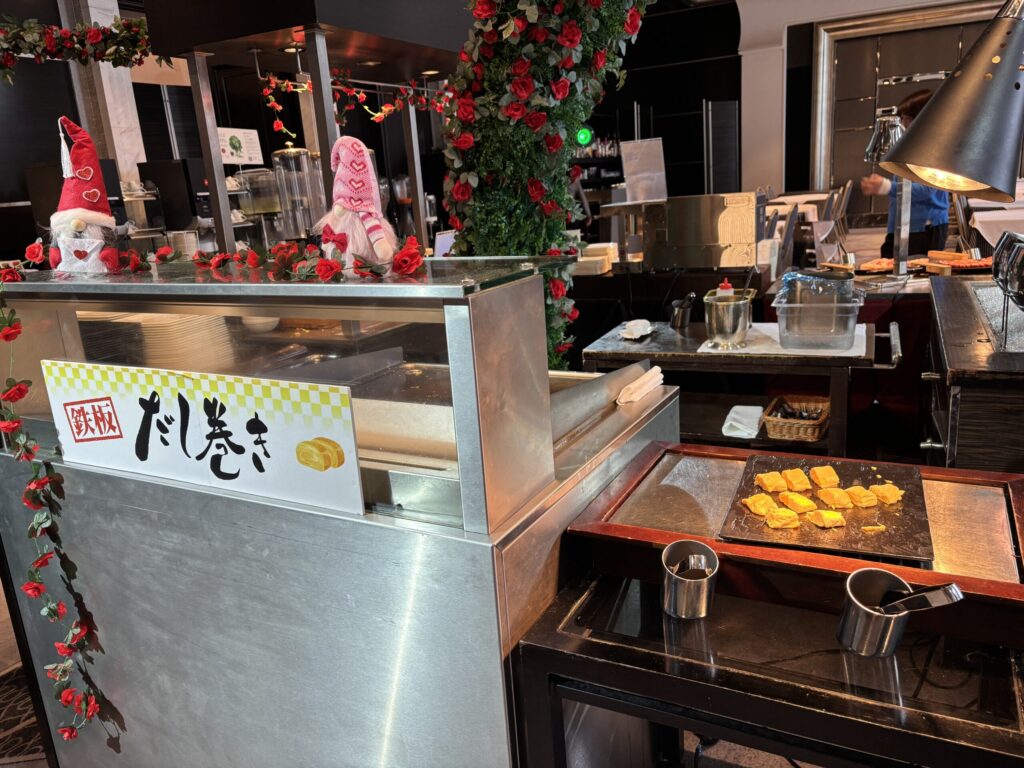真ん中には目の前で作ってくれるだし巻き卵や自分で作れるパンケーキ。その周りにドリンクが並びます。