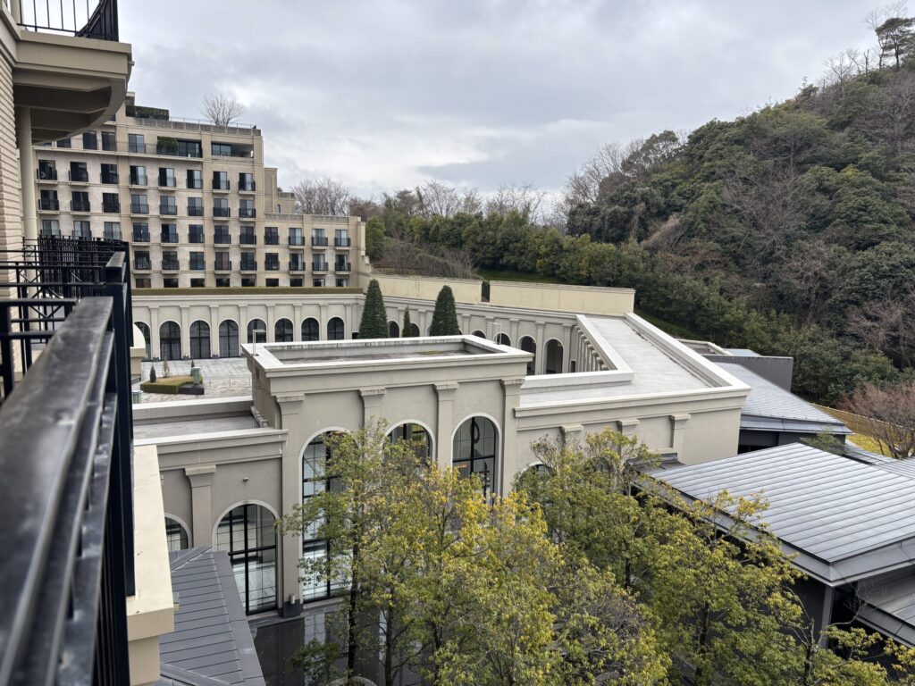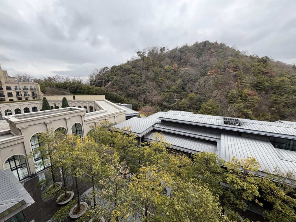 お部屋からの眺望。正面下方に和食レストラン、その前の水盤が見えました。