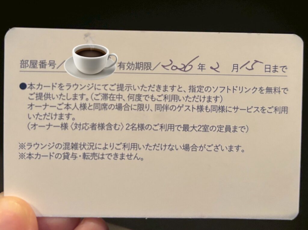 ここから入るとすぐにフロントデスクがあり、チェックインの手続き。その時このようなカードをいただきました。これがあればいつでもラウンジでドリンクが飲めるとのこと。こんなサービスがあるとは知らなかった🙌