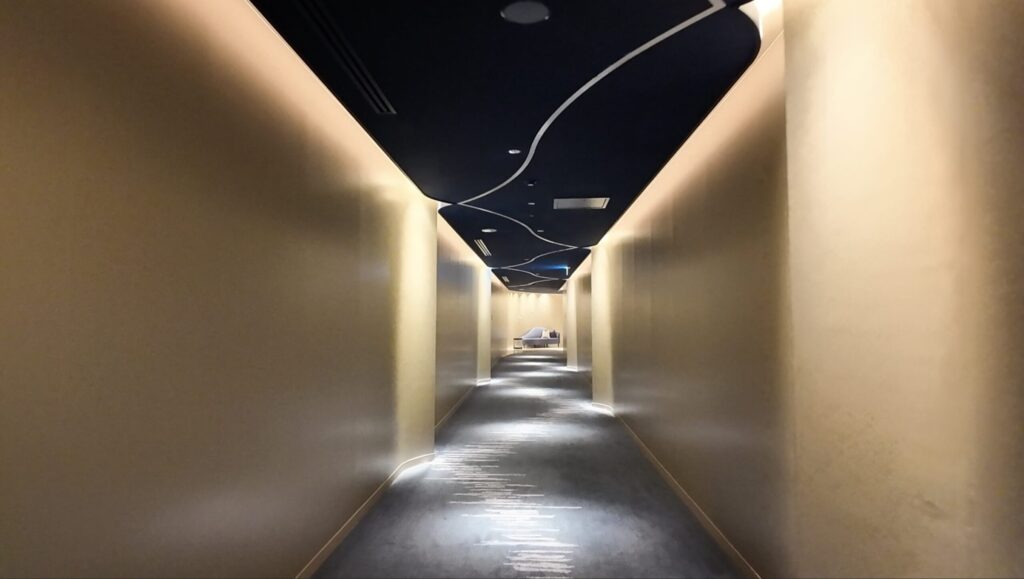 スパ施設へは、まず地下1階に降りて、そこから長ーーい宿泊者専用通路をひたすら進みます。