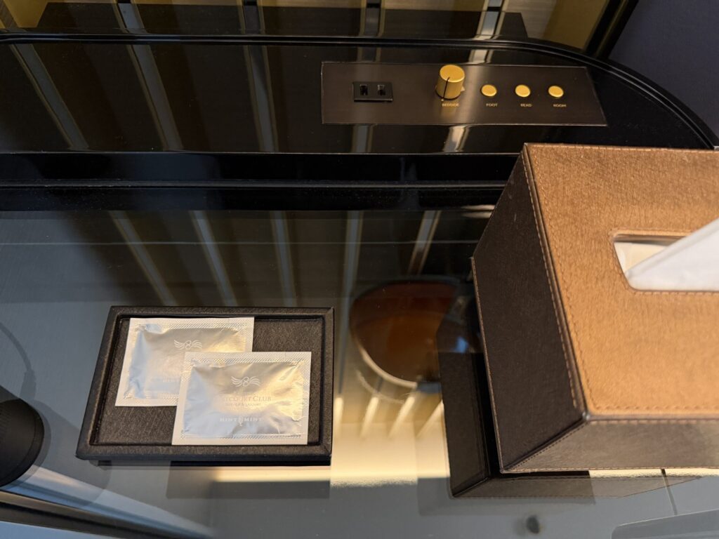 どちらの寝室もベッドサイドは下の写真のような感じでした。ベッドサイドにミントタブレットがあるのもお決まりですね。