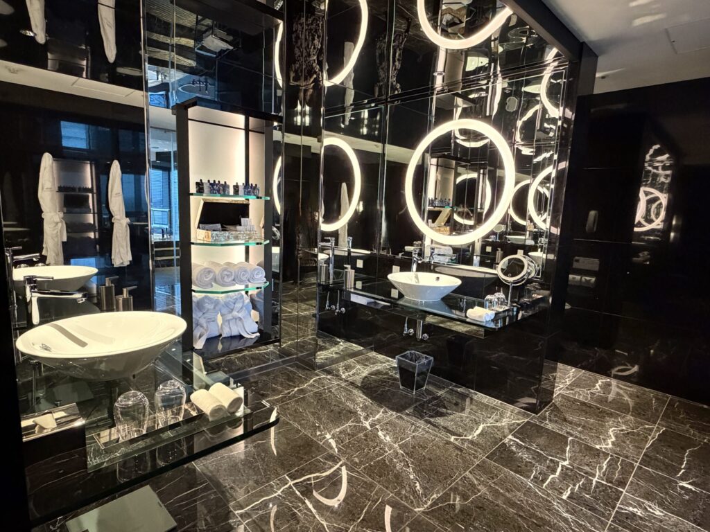 洗面台は二つが向かい合っています。鏡だらけで目が眩みそうです笑