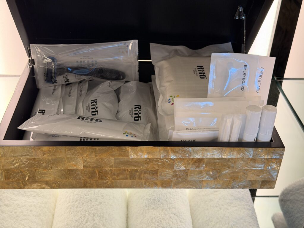 - 箱の中は歯ブラシ・ヘアブラシ・カミソリ・ボディタオル・コットン・綿棒・ヘアゴム・爪やすりなど。