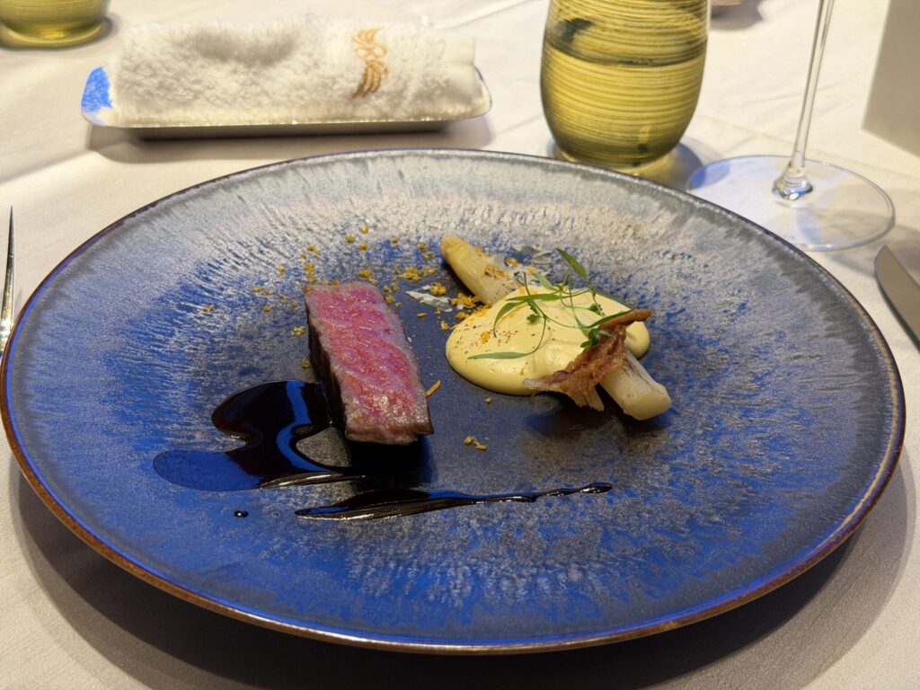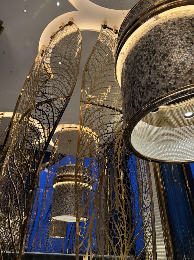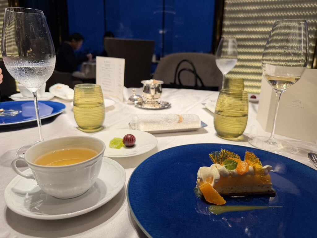 食べている間に日が暮れ、夜空の紺色と店内のゴールドのコントラストがとても美しかったです。非日常感を味わえるレストランでした。