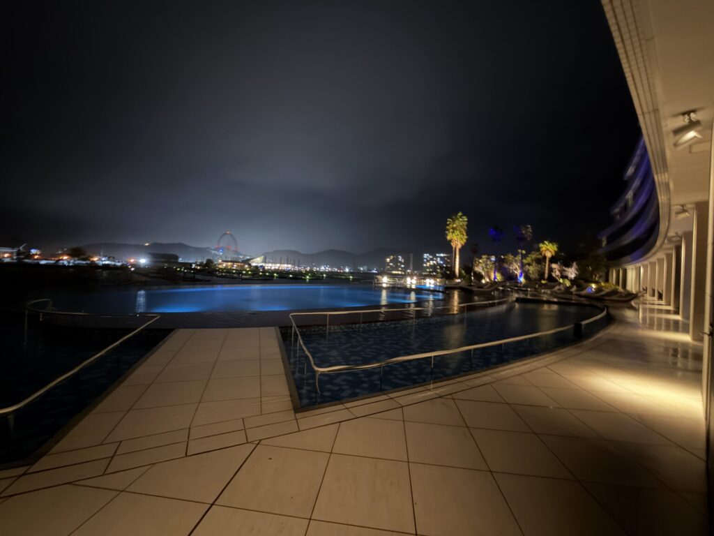 水盤越しに望む対岸のリゾートの風景。非日常感に溢れています。