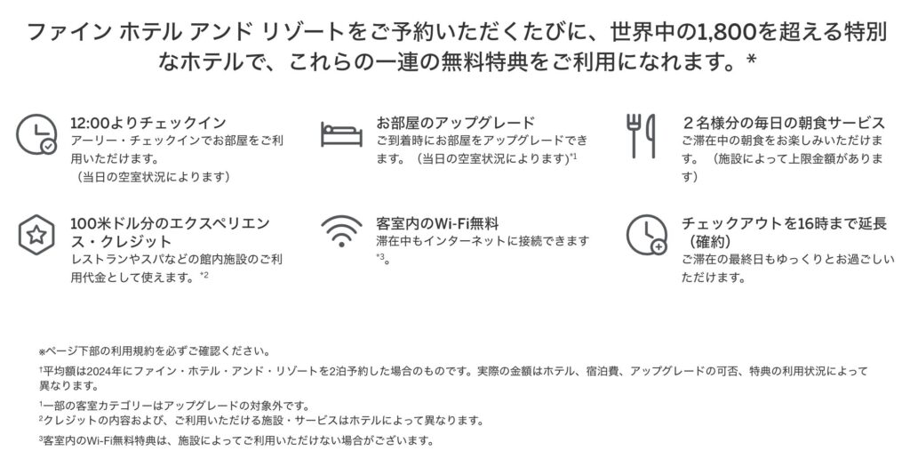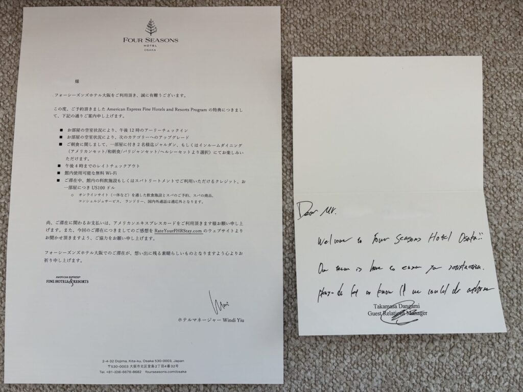 1月の連休にフォーシーズンズホテル大阪に宿泊してきました。前の週にドバイから帰ってきたばかりで、気軽に行ける大阪市内のホテルでゆっくりしようということになり、まだ泊まっていなかったこちらに決定。完成した頃からずっと泊まりたかったホテルです。予約はAMEXプラチナのファインホテルアンドリゾート経由で予約しました。こちらで予約すると以下のような得点があります。