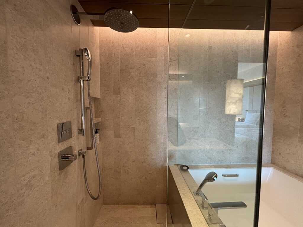 シャワールーム。ハンドシャワーとレインシャワーがあります。隣のバスタブも広いです。