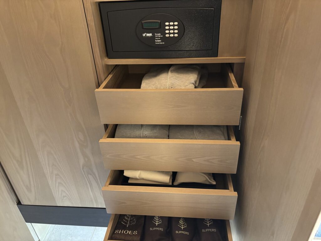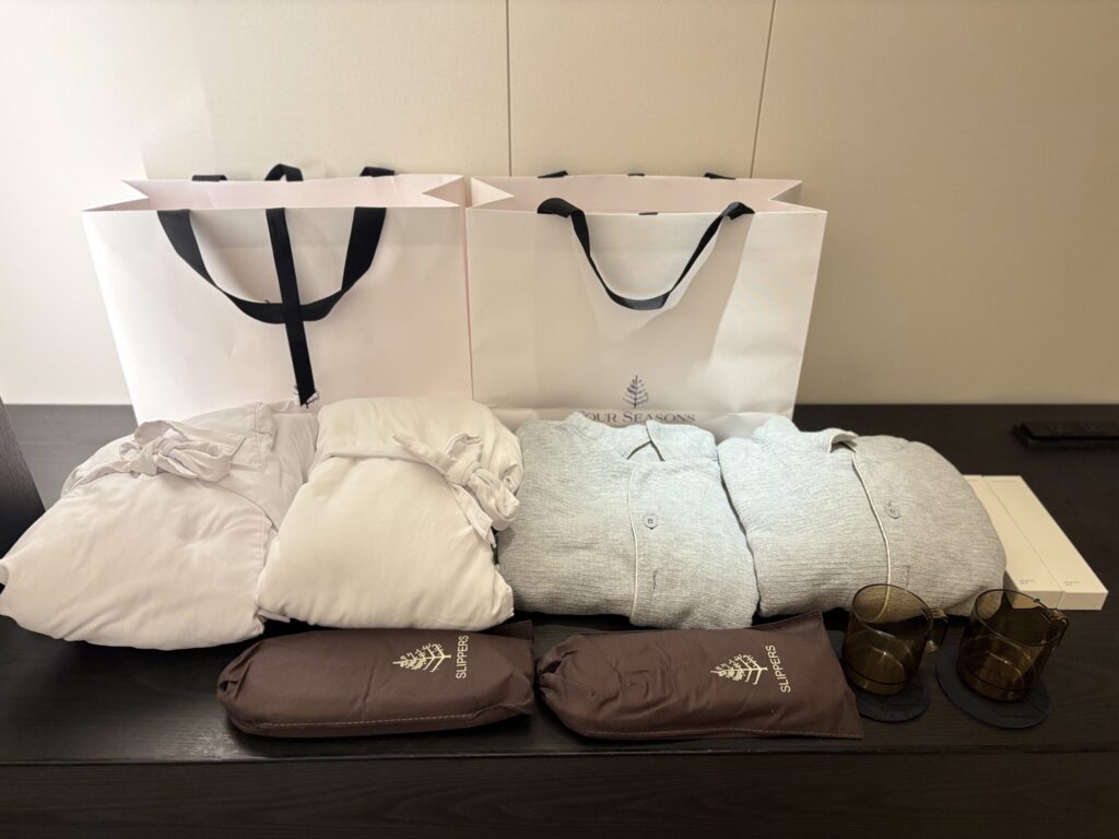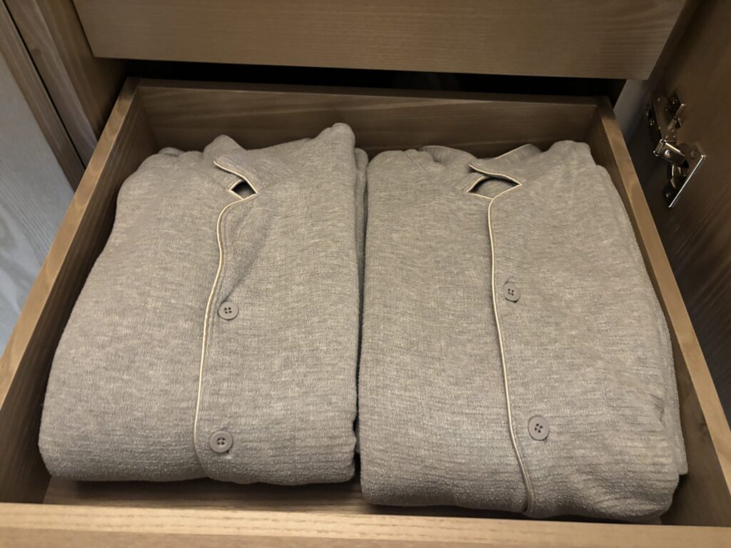 クローゼットの引き出しにパジャマやスリッパが用意されていました。パジャマはワッフル生地でふわっとして着心地が良いです。(フォーシーズン大手町と同じような気がします。)