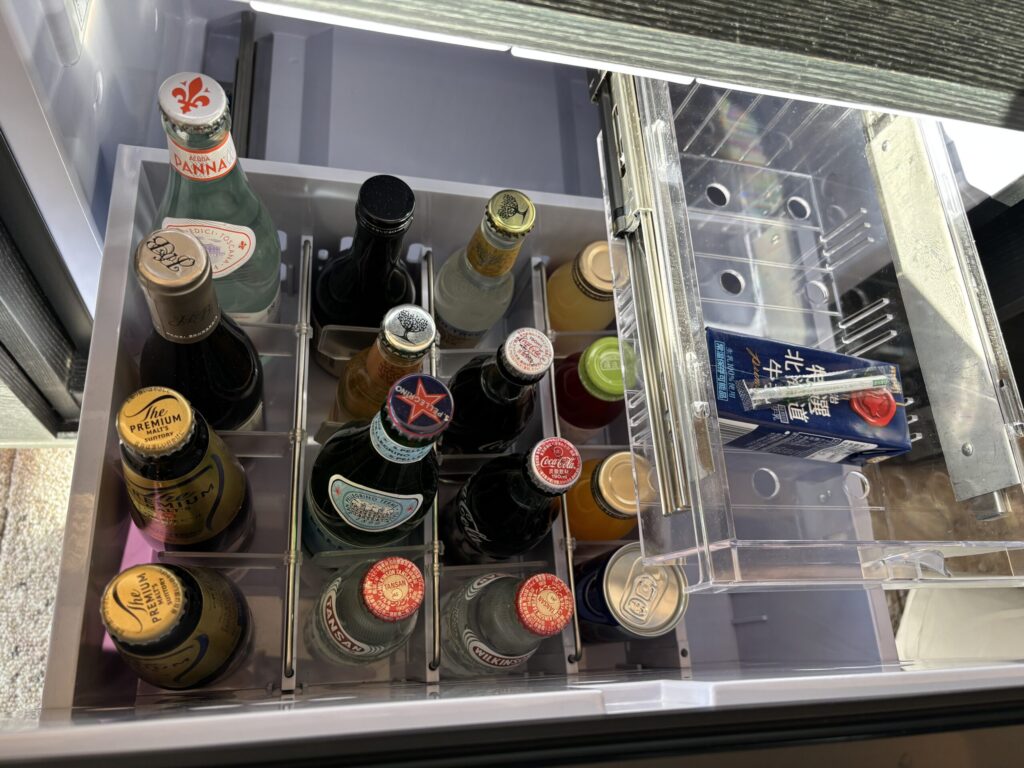 冷蔵庫はこのように引き出して使う形で、もともとドリンクが入っています。持ってきたペットボトルぐらいなら入りそうですが例えば買ってきたお弁当やデザートを入れたりするのは難しそうです💦