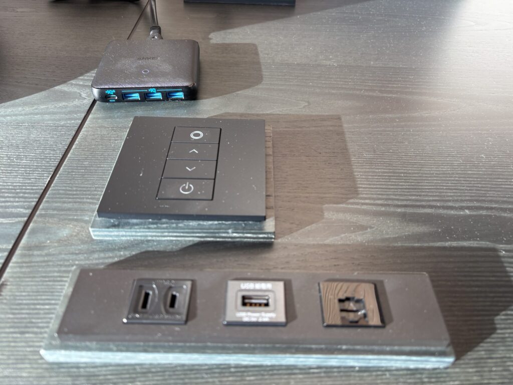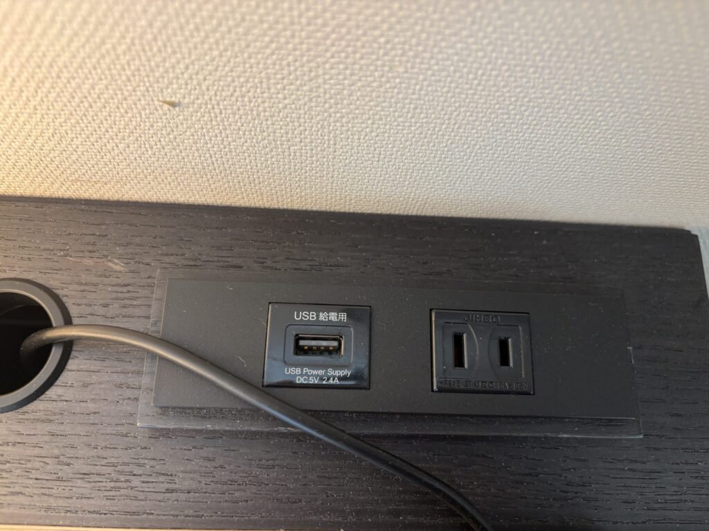 USBポートとコンセント。備え付けはUSB-Aしかありませんが、USBハブが設置されており、こちらだとUSB-Cも使えました。