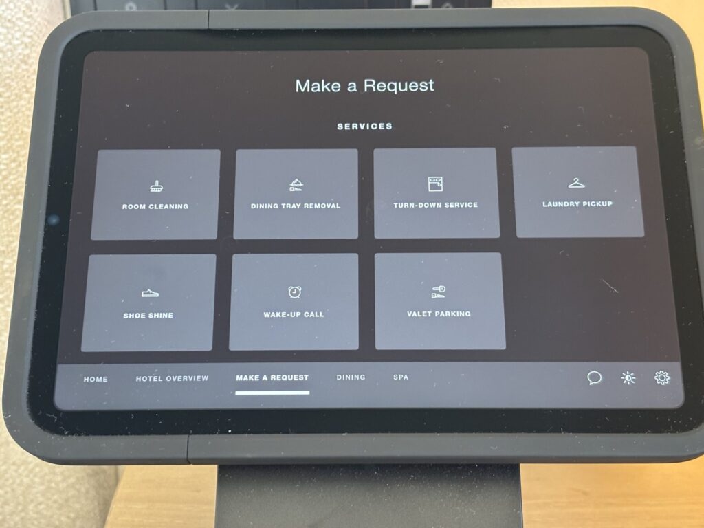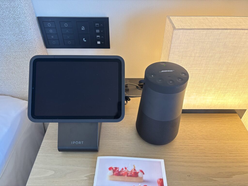 ベッドサイドにタブレットがあり、こちらからアメニティのオーダーもできます。BOSEのBluetoothスピーカーもあります。