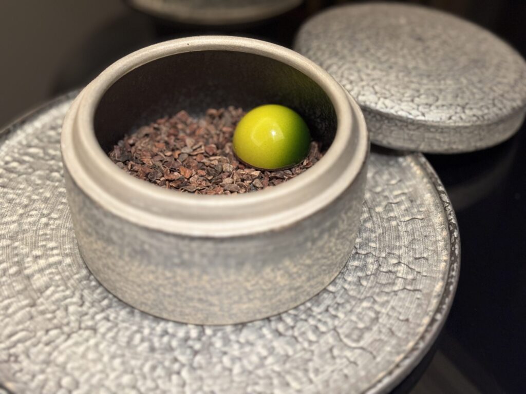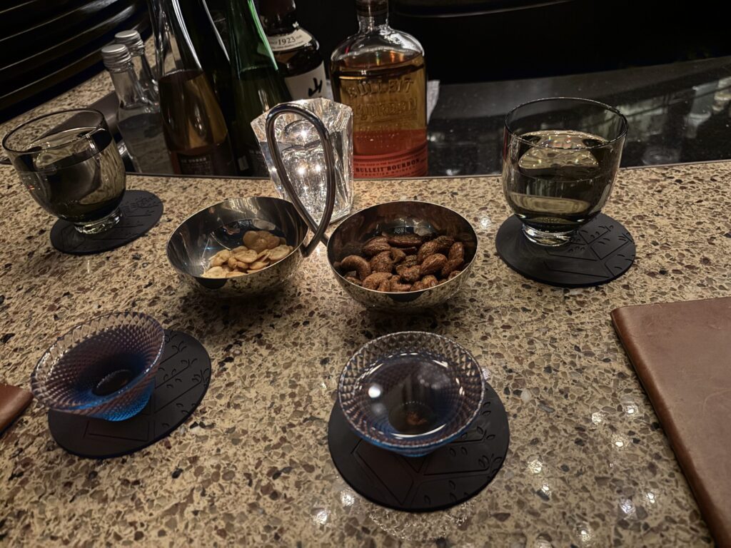 注文すると、お通しとしてナッツ2種とウェルカムドリンクが来ました。このナッツ2種類がすごく美味しかったです。