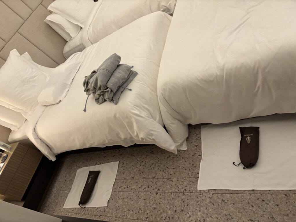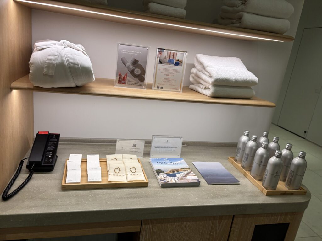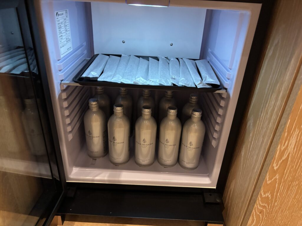 他にタオル類、バスローブ、水が置かれていました。個人的にはヘアゴム、濡れものを入れる袋があるのがとてもありがたいです。(いつも言ってますがこの二つがないホテルが多いです。)冷蔵庫内に冷えたおしぼりと水もありました。