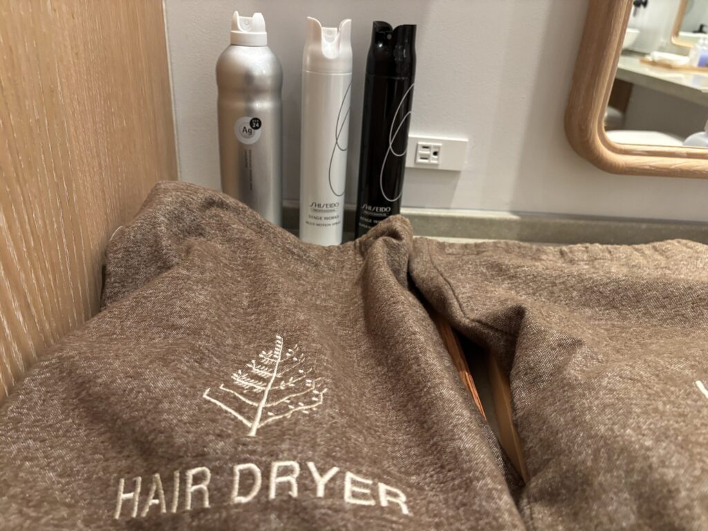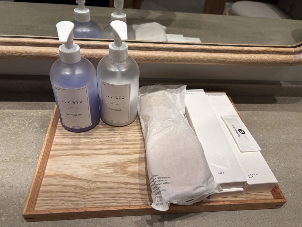 洗面台のアメニティは化粧水、乳液、ヘアブラシ、歯ブラシ。デオドランドやヘアスプレーもありました。