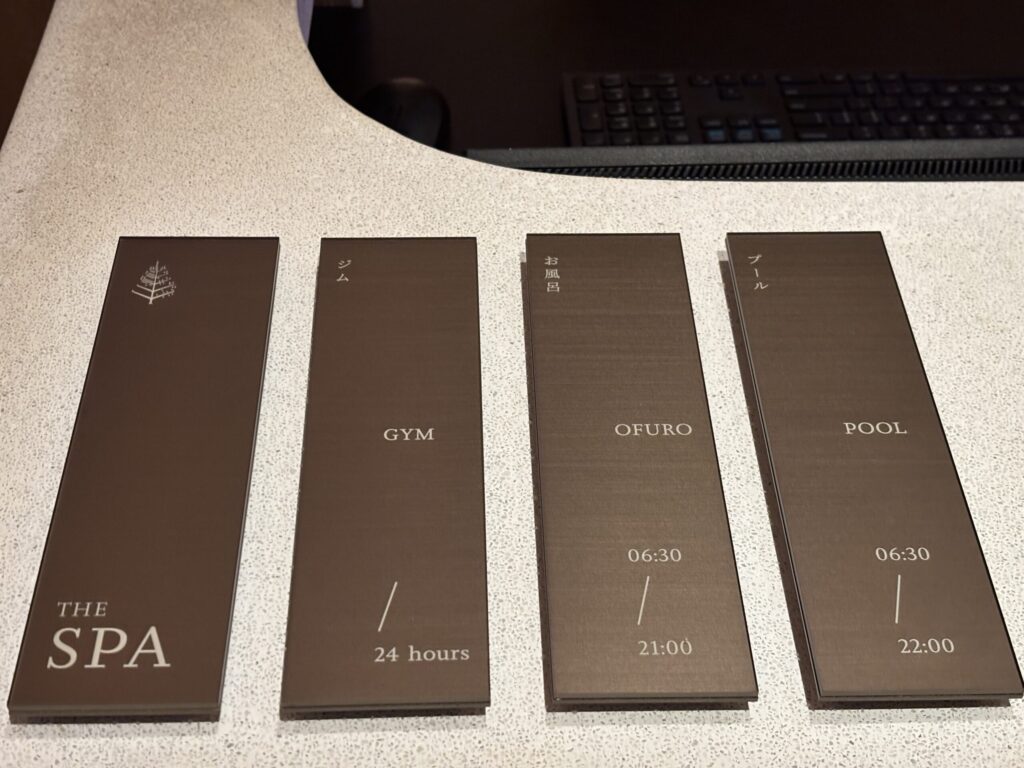 レセプションにこのような札がありました。こちらを見る限りお風呂は以前は21時までだったのかもしれまんが22時まで使えましたし最終入場時間も決められておらず、ギリギリでも入れるようでした。