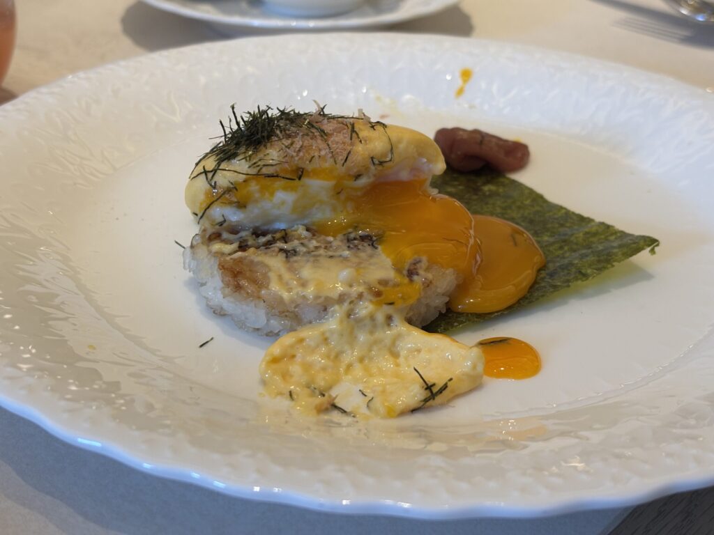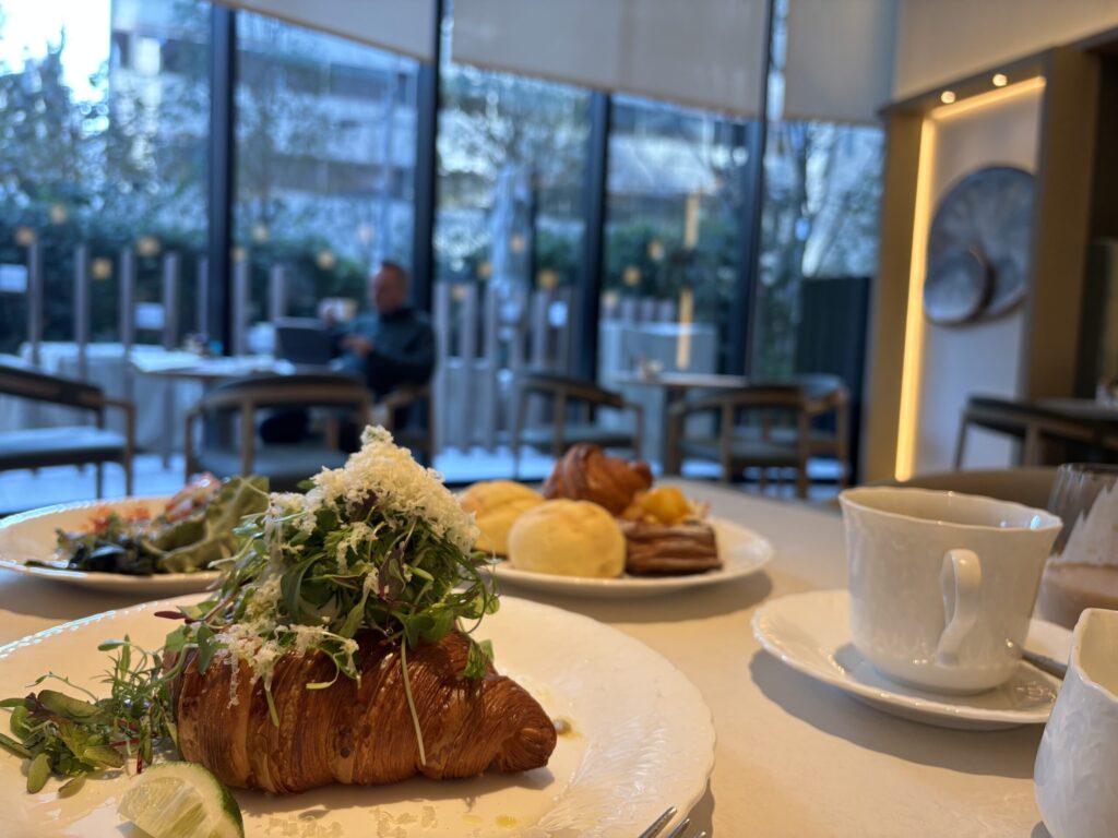 さてオーダーメニューが来ました。焼きおにぎりと自家製クロワッサンベネディクトです。スタッフによるとクロワッサンベネディクトがシグネチャーメニューとのことでオーダーました。確かにサクサク感と卵のトロトロ感とスプラウトのバランスがよく、味わったことのない食感で美味しかったです✨(他のオーダーメニューを撮り忘れました💦)
