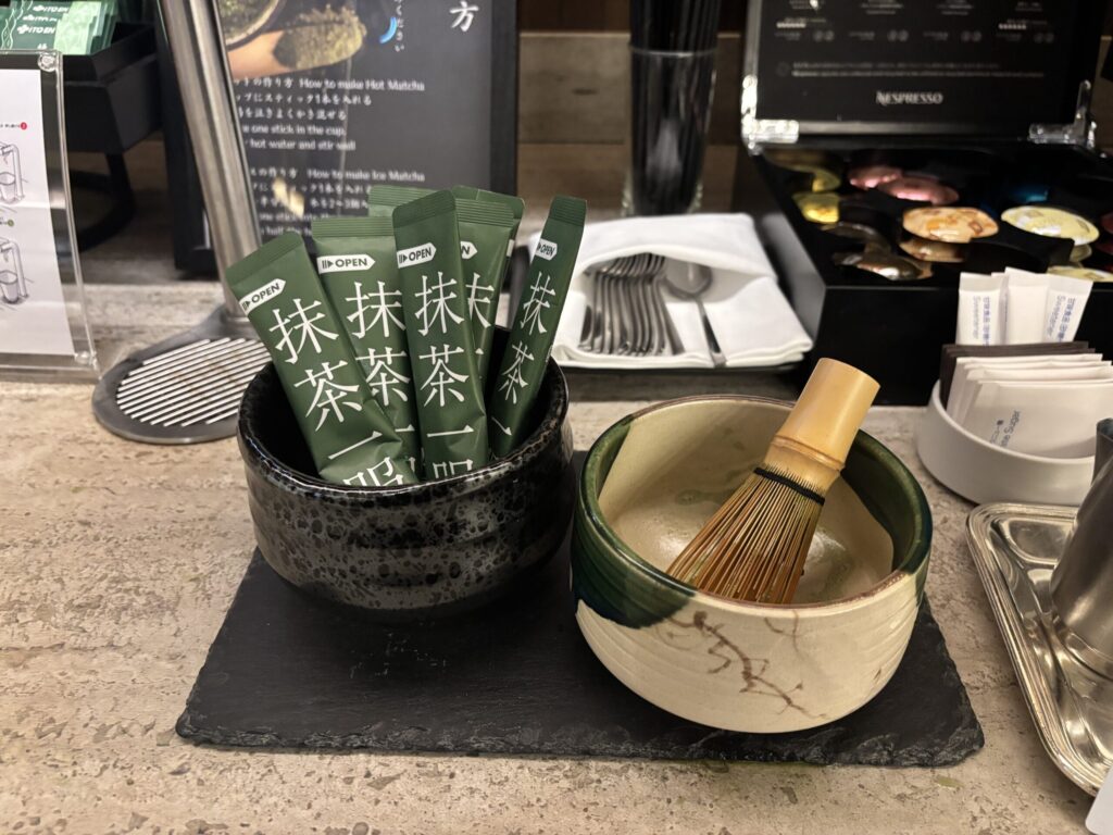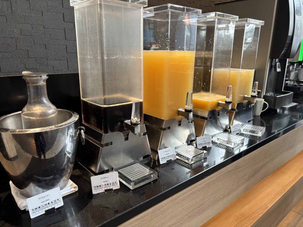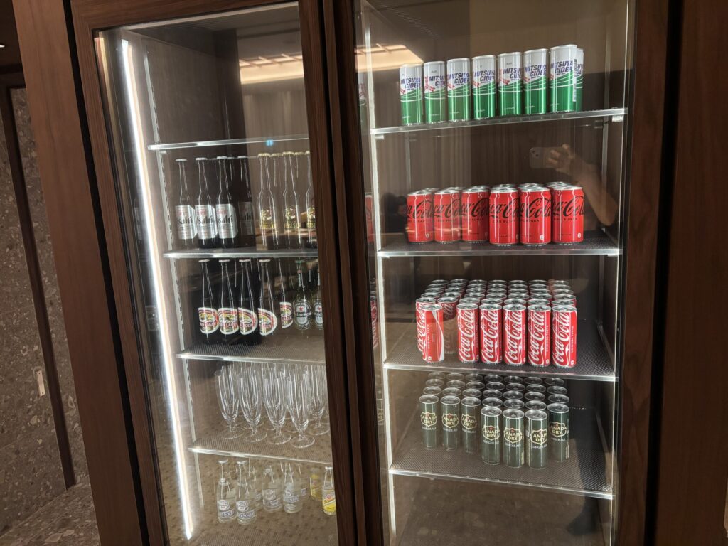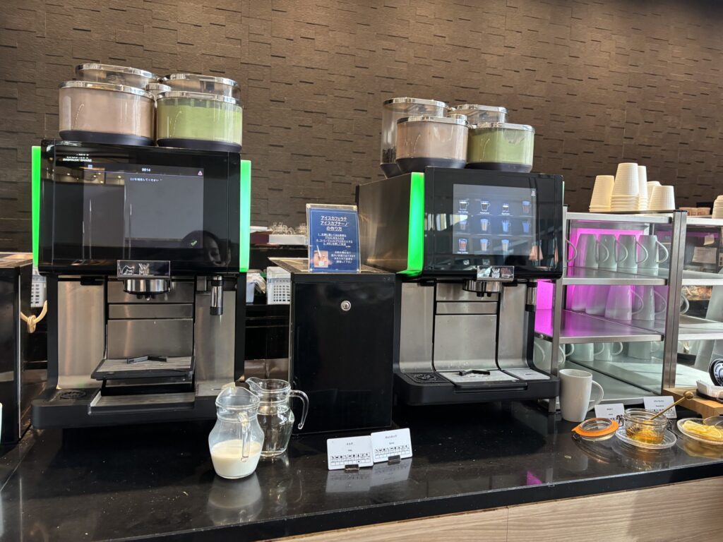 ドリンクはジュースや、冷蔵庫に缶のコーラ・スプライト・ジンジャーエール。大きなエスプレッソマシンもあり、紅茶の茶葉も種類豊富。お抹茶も作れるのが面白かったです。サンドイッチやスイーツも何種類かありました。