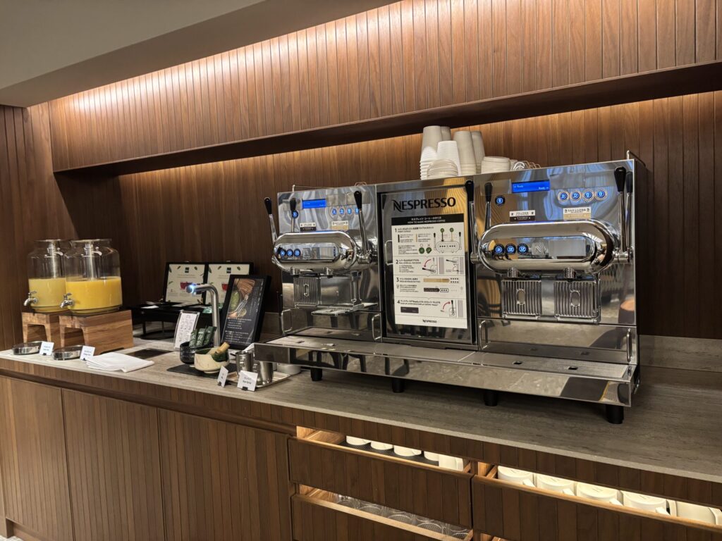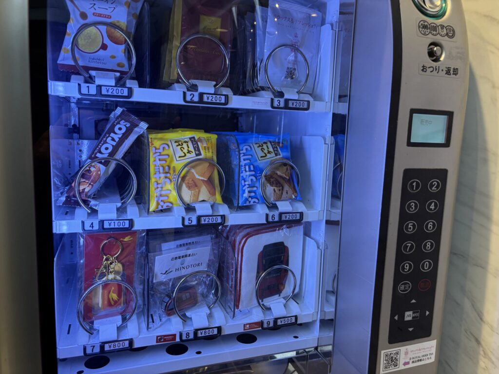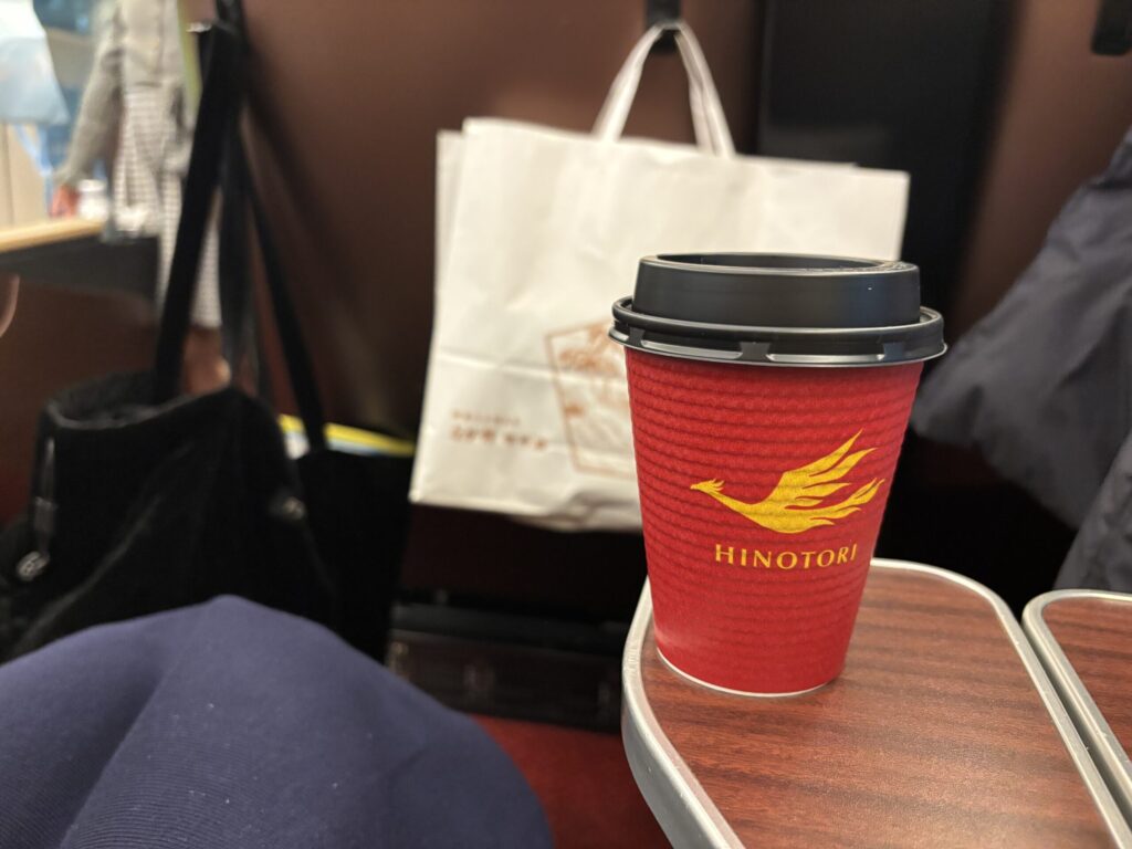 プレミアムの車両にはこのようなコーヒーマシンとグッズ自販機がありました。コーヒ−は200円、手頃なので試しに買ってみました。コーヒー1杯あるだけで旅気分があがる気がします。グッズも、この車内限定だそうなので記念にタオルハンカチを買いました。
