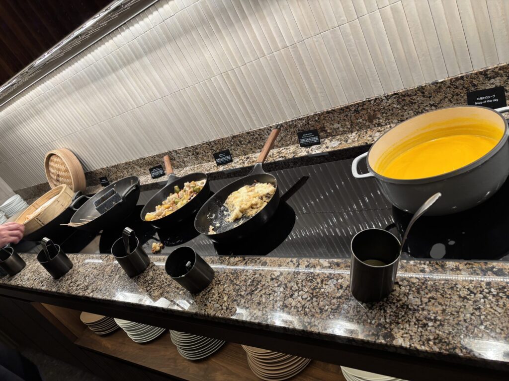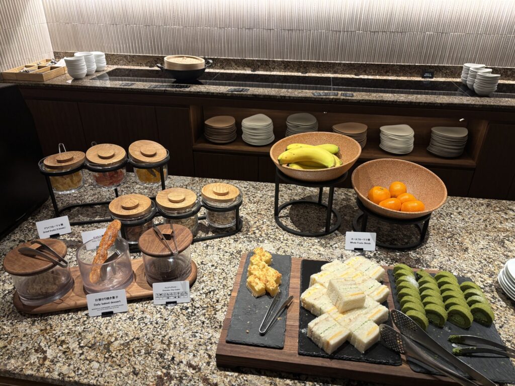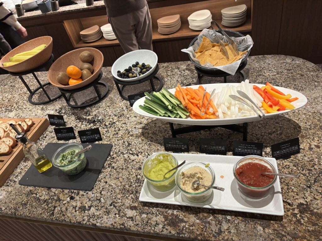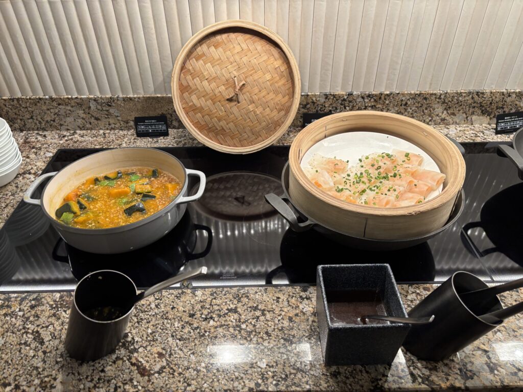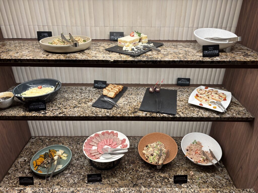 コールドミールは野菜スティックやサラダ、角切り鮪乗せ冷奴、ハム、チーズ。カナッペやパンもあり、ホットミールも3種類、点心や煮物料理、スープも。スイーツやフルーツもありました。我が家的には夕食として十分でした。