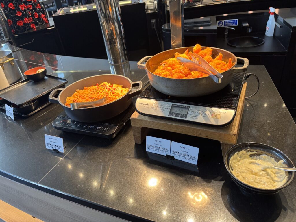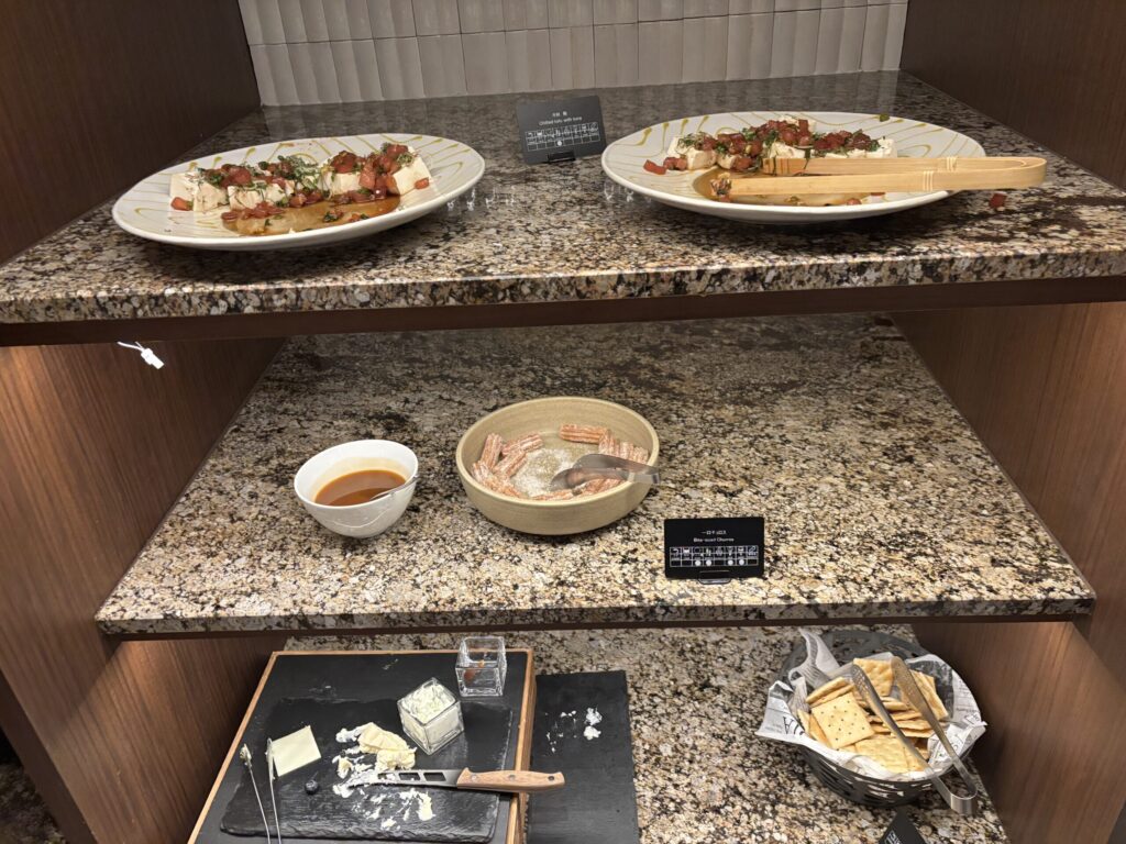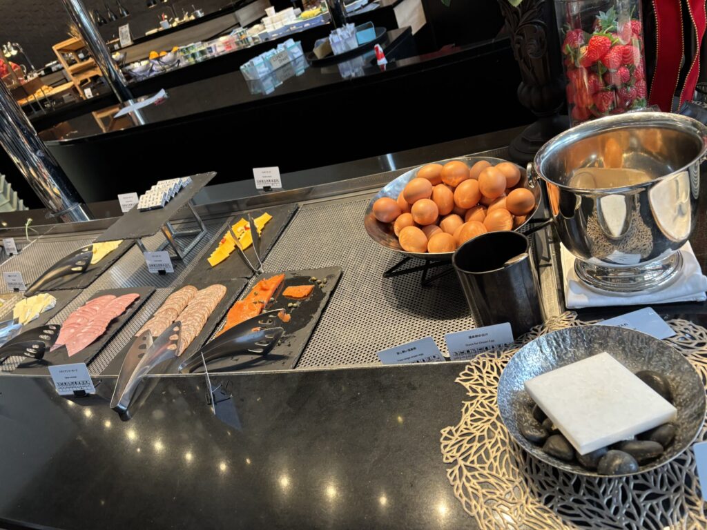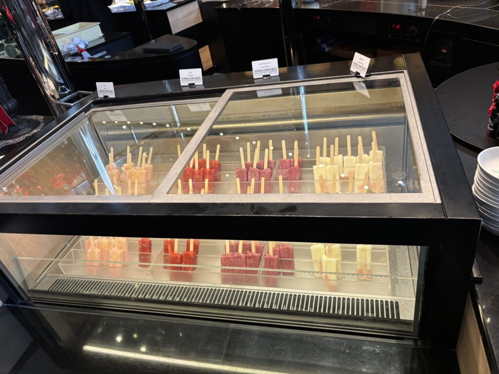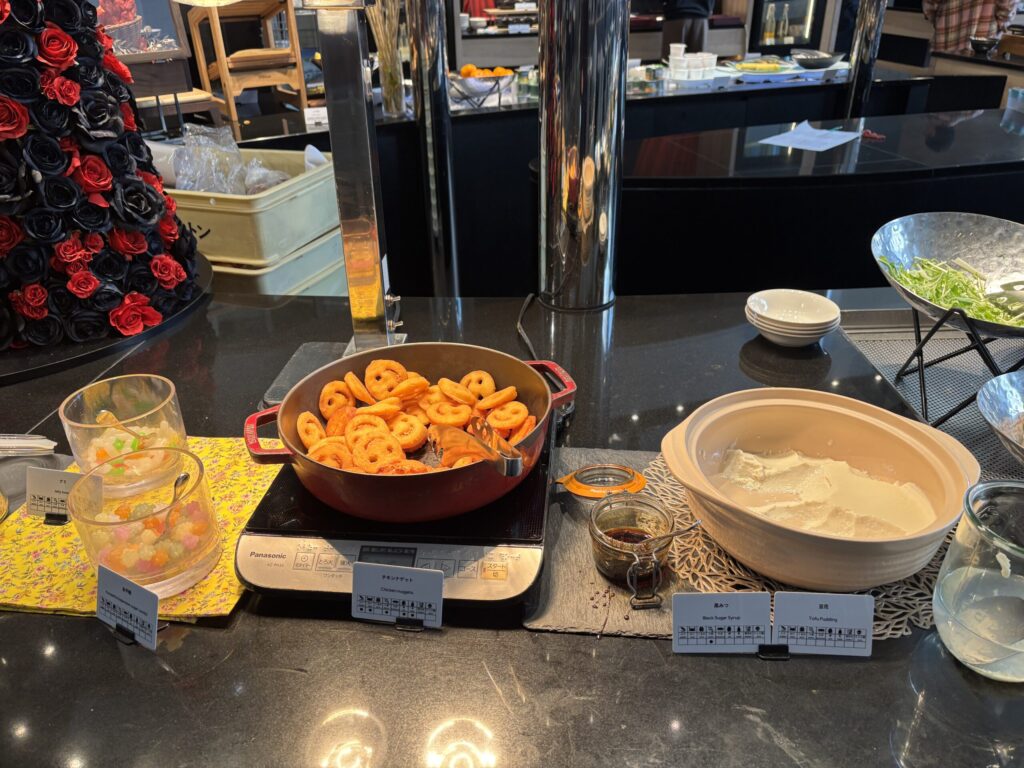 コールドミールは野菜スティックやサラダ、角切り鮪乗せ冷奴、ハム、チーズ。カナッペやパンもあり、ホットミールも3種類、点心や煮物料理、スープも。スイーツやフルーツもありました。我が家的には夕食として十分でした。
