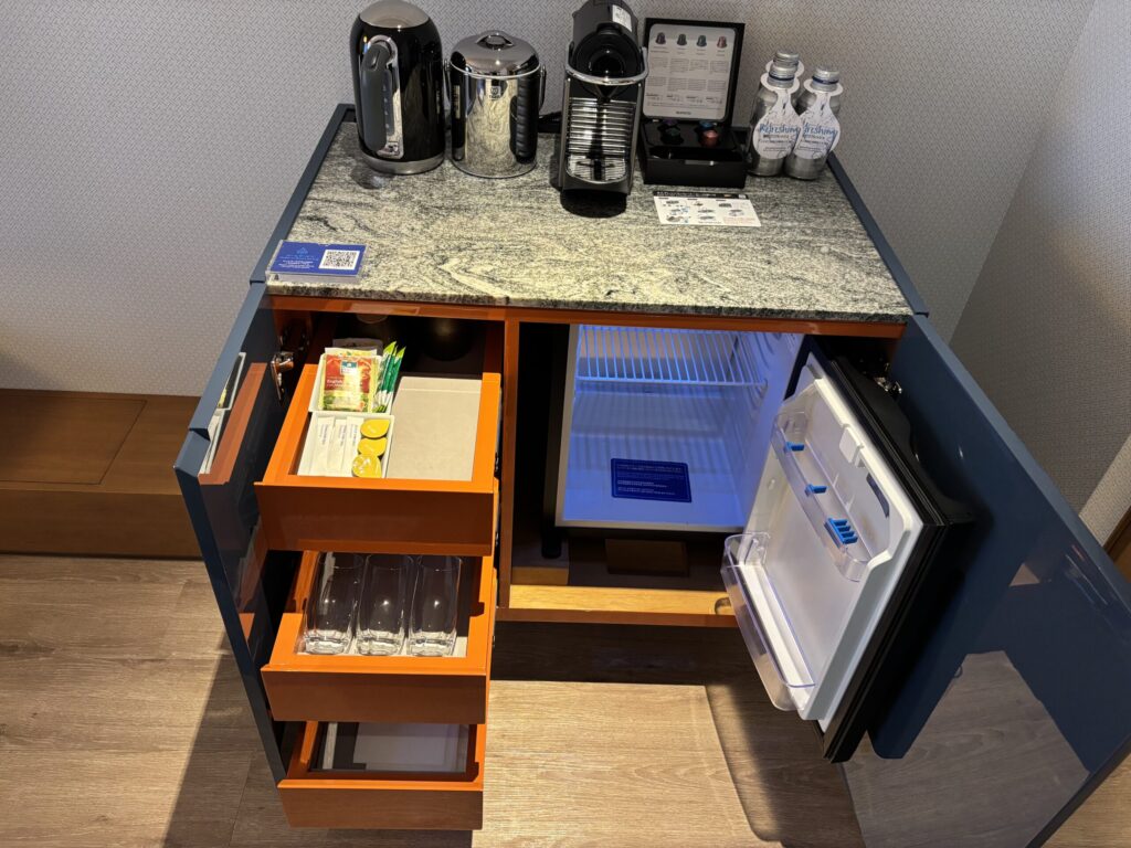 ミニバーや冷蔵庫はこんな感じです。アルミペットのお水がありました。冷蔵庫は空で使いやすいです。