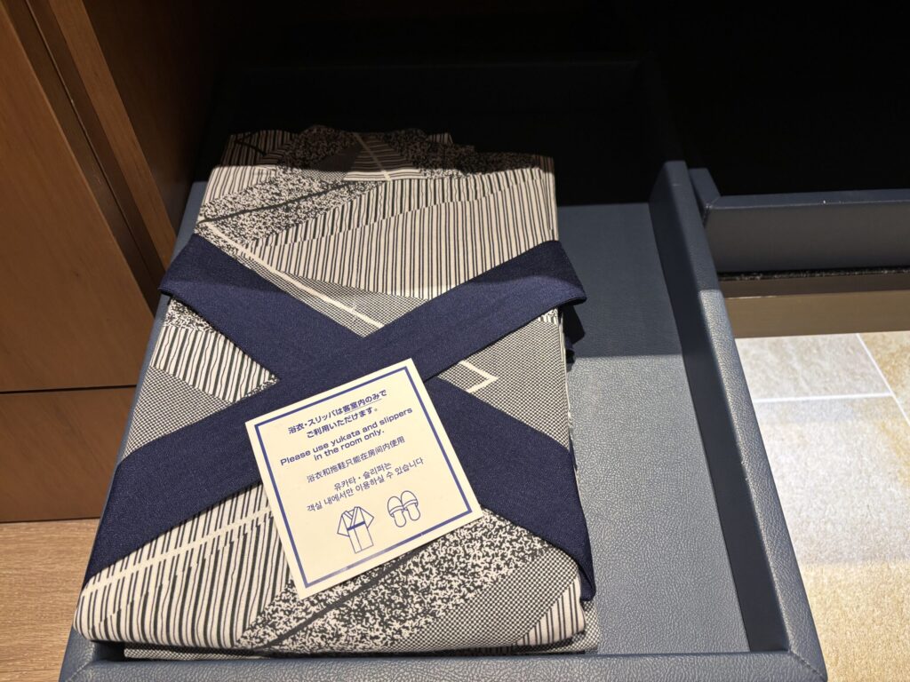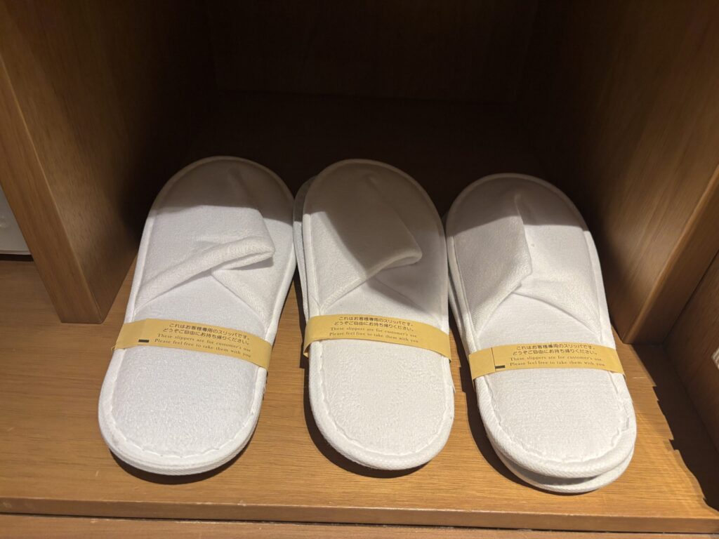 浴衣、スリッパが用意されていました。浴衣とスリッパは室内のみとの注意書きが。スパ施設などに行く時は私服と靴で行かないといけないようで、これは少し不便に感じました。(真冬で私や娘はブーツだったので...)