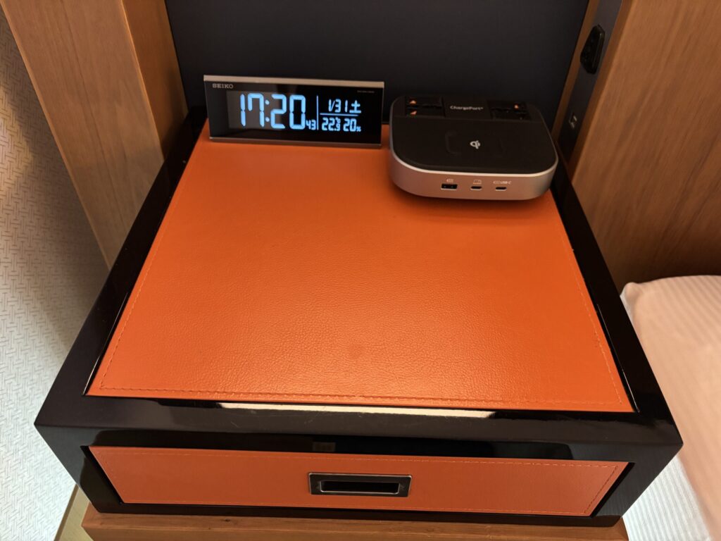 ベッドサイドはこんな感じです。両サイドに壁付で全世界対応コンセントがあり、さらにUSB-A、USB-C、全世界プラグが使えるハブも用意されていました。