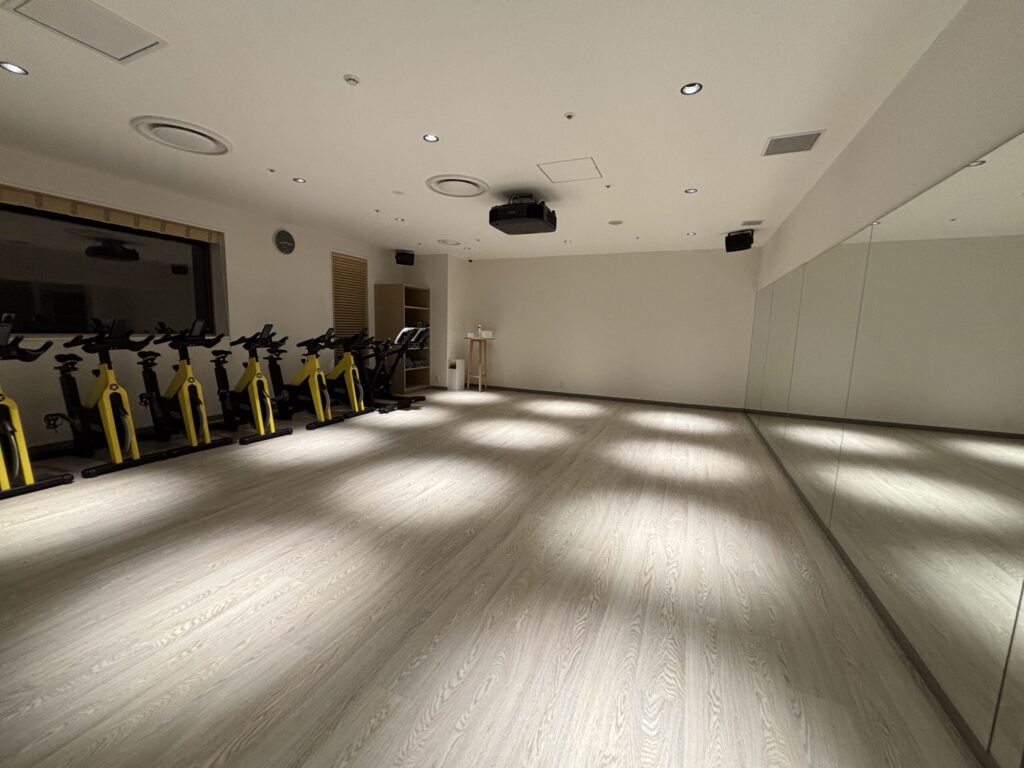 このロッカールームから奥に出るとまた男女共用エリアです。まずジムがあります。このジムがかなり広く、充実していました。