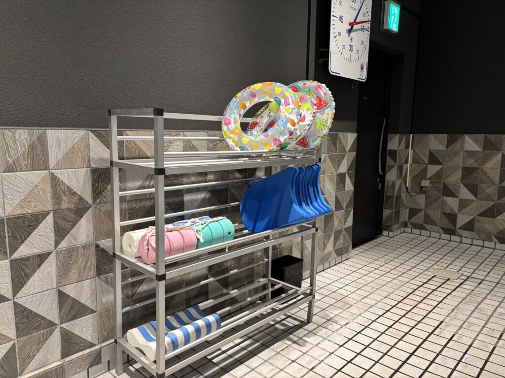 ビート板や浮き輪などの道具がいろいろありました。古いホテルのプールという感じで、最近の都心の外資系ホテルのような高級感やおしゃれさはないですが子連れには使いやすいプールでした。
