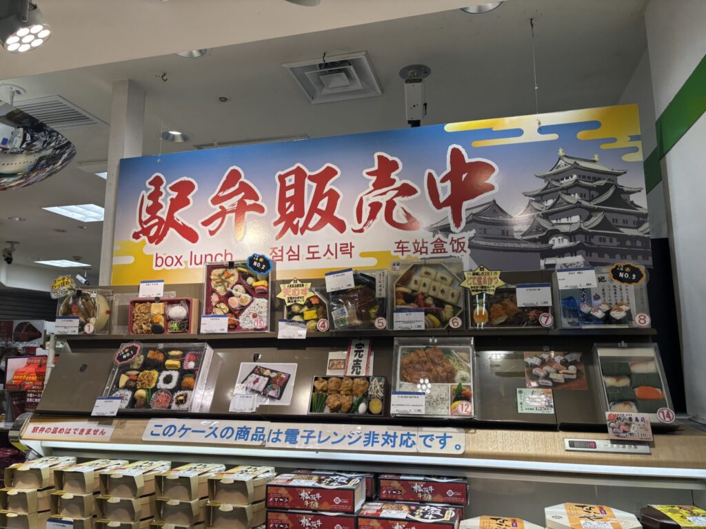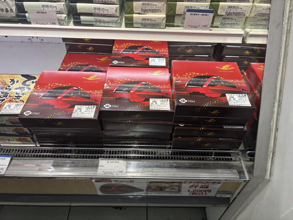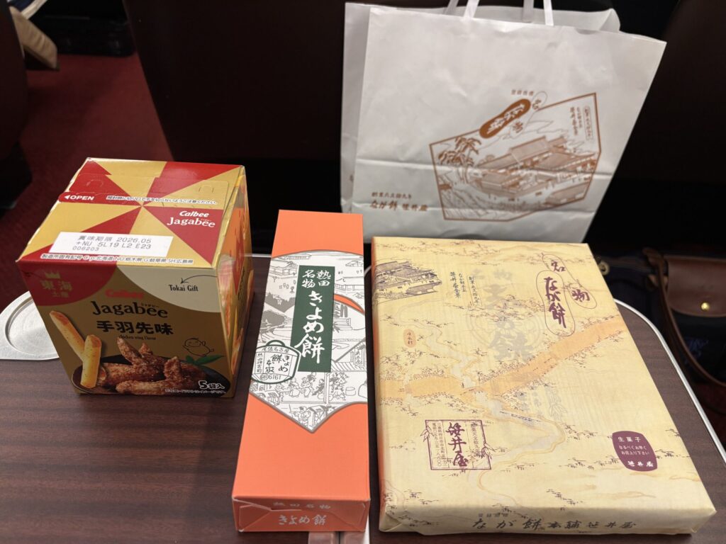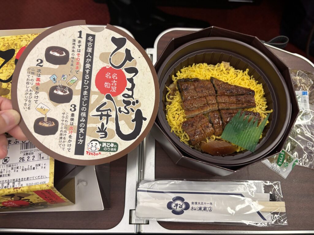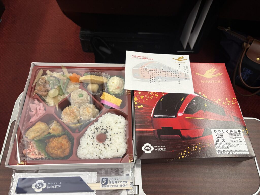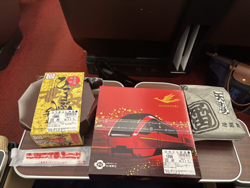 さて早めにホームに入り、改札内の売店で駅弁も購入。ここはせっかくなので「ひのとり弁当」にしました。他に名古屋らしい物を求めて、ひつまぶしと天むすも購入。(ちなみに改札に入る前に名鉄などのデパ地下もちらっと見たのですが、あまり名古屋らしいお弁当のような気の利いたものが見つからずでした・・・この改札内が一番揃っていた印象です。)