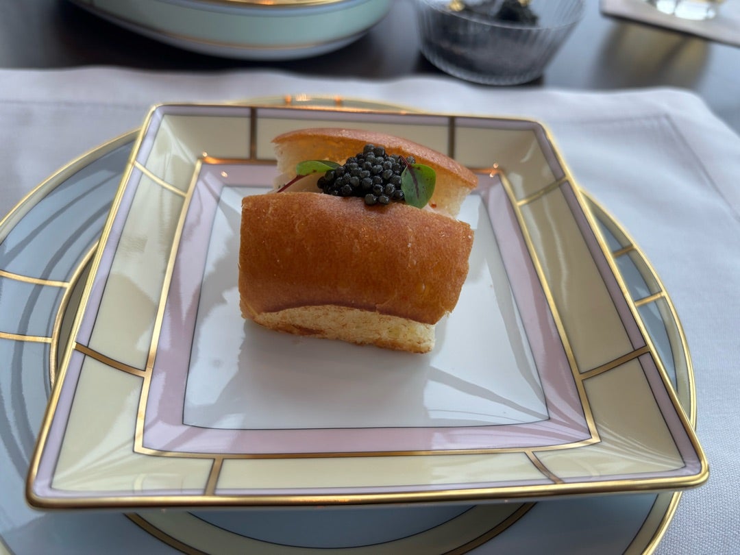 キャビアの乗った竹炭マカロン、スコーン(プレーンとピスタチオ)